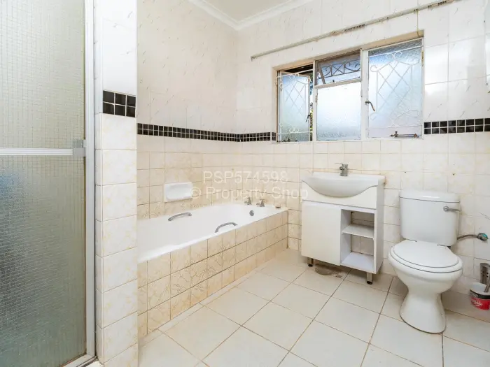 Accommodation comprises three comfortable bedrooms, all offering built-in cupboard space, large windows, and pleasant garden views. The bedrooms are serviced by a neatly tiled shared bathroom with a bathtub, separate shower, washbasin, and toilet.