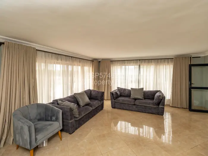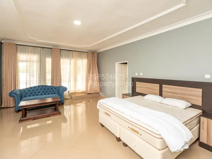 It has 6 bedrooms. The main bedroom is massive with a private lounge, walk in closet and en suite. It opens up onto the big entertaining verandah situated on top of a flatlet. There are 3 additional bedrooms within the same wing sharing 2 bathrooms. Two of the guest bedrooms have double beds in them and the 3rd one has 2 double beds. On the lower level, there is a one bed flatlet complete with a good sized lounge, a kitchenette with a fitted hob and oven and sink, as well as the a king size bedroom with en suite. The flatlet has direct access from outside as well as interconnections within the main house. The 6th bedrooms can be used as staff quarters because of its location and it has a a double bed, a walk in closet and en suite. All bedrooms have TV sets in them and tastefully furnished.