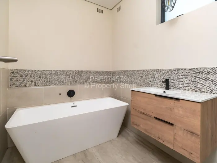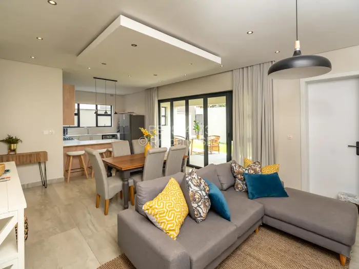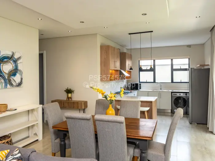 Alternatively, consider the stunning 1st-floor apartment featuring double vaulted ceilings. It includes an open-plan kitchen, dining, and living area that opens onto a large veranda, spacious enough to accommodate a dining table and lounge suite. The apartment's design is elegant, with high-quality finishes.