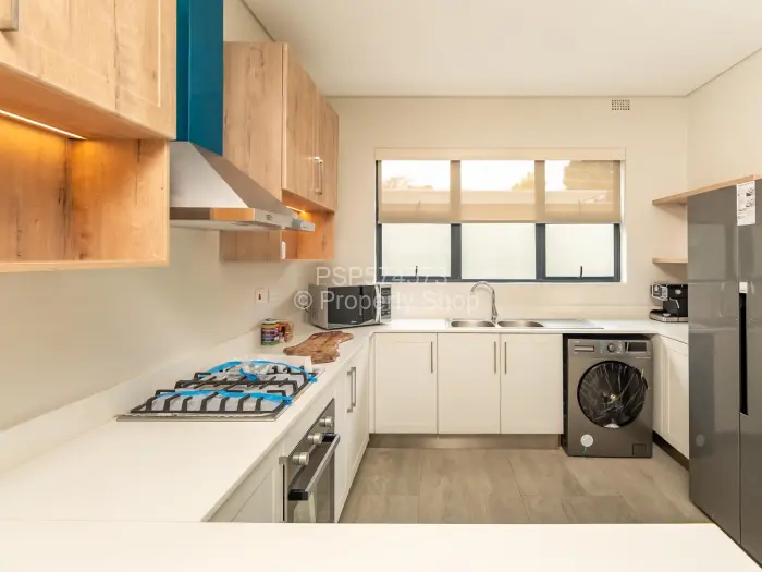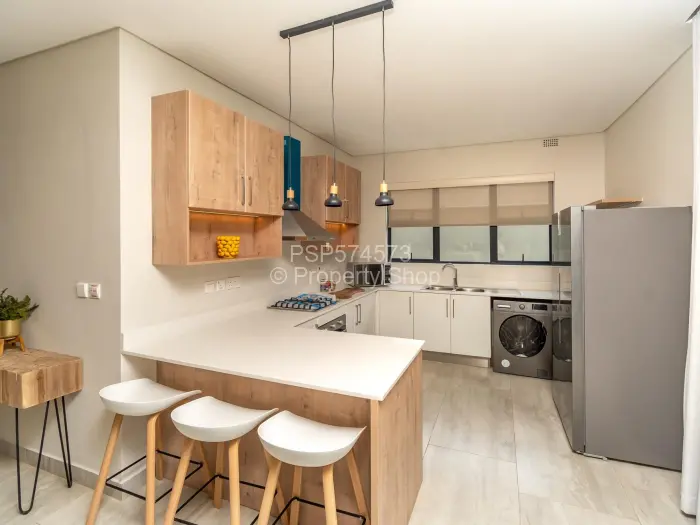 - Kitchen: The modern kitchen includes a breakfast bar, a 4-ring gas hob, a gas oven, space for a washing machine, a double-door fridge, and ample cupboard space.